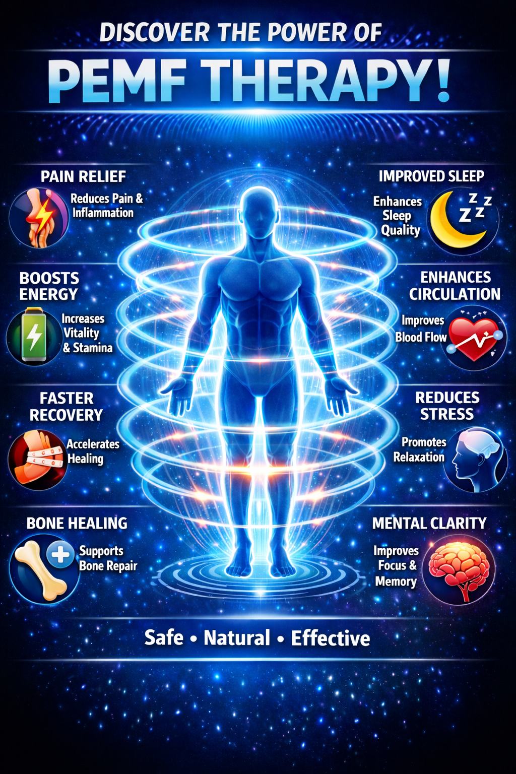 PEMF Therapy offers a wide range of natural, non-invasive health benefits by enhancing the body’s own healing mechanisms. These include: